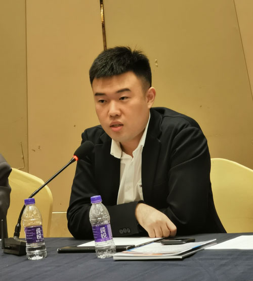 東華鏈條集團副董事長宣成發言。他說,今年全球鏈傳動行業下行,國內外競爭非常激烈。上個月我去參加歐洲鏈傳動協會的會議,今年整個歐洲鏈傳動下滑8%,對明年的預期也是下滑。