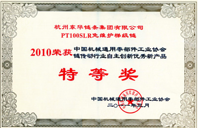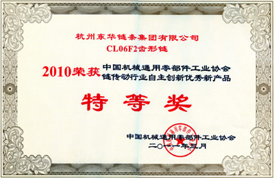 會上,中國機械通用零部件工業(yè)協(xié)會對2010年自主創(chuàng)新先進企業(yè)及自主創(chuàng)新優(yōu)秀新產(chǎn)品進行表彰。東華集團被授予“2009~2010年度自主創(chuàng)新先進企業(yè)”榮譽稱號;東華集團生產(chǎn)的“PT100SLR免維護梯級鏈”和“CL06F2齒形鏈”榮獲中國機械通用零部件工業(yè)協(xié)會鏈傳動行業(yè)自主創(chuàng)新優(yōu)秀新產(chǎn)品特等獎;另有5個新產(chǎn)品榮獲自主創(chuàng)新優(yōu)秀新產(chǎn)品優(yōu)秀獎。董事長助理、黨委書記張世強上臺領獎。