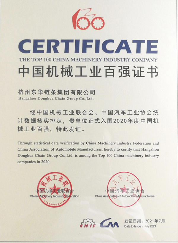 東華鏈條集團(tuán)再次榮登中國(guó)機(jī)械工業(yè)百?gòu)?qiáng)榜,排名第55位,這是東華鏈條集團(tuán)連續(xù)六年榮登中國(guó)機(jī)械工業(yè)百?gòu)?qiáng)榜,也是中國(guó)鏈傳動(dòng)行業(yè)唯一上榜企業(yè),展現(xiàn)出東華強(qiáng)勁的健康發(fā)展活力。