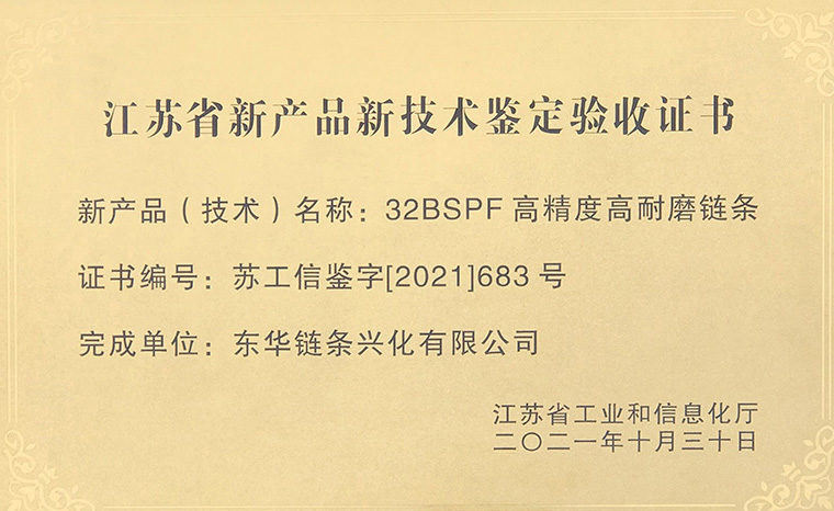 日前, 東華鏈條興化公司收到江蘇省工業(yè)和信息化廳頒發(fā)的江蘇省省級工業(yè)新產(chǎn)品新技術(shù)驗(yàn)收證書,公司研制的“32BSPF高精度高耐磨鏈條”產(chǎn)品通過省級工業(yè)新產(chǎn)品鑒定。