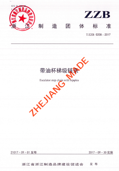 日前,浙江省浙江制造品牌建設促進會印發“浙促會標發[2017]43號”文件,批準發布由浙江藍箭萬幫標準技術有限公司牽頭組織制訂、杭州東華鏈條集團有限公司負責起草(主導制訂)的“浙江制造”團體標準T/ZZB 0208—2017《帶油杯梯級鏈條》。