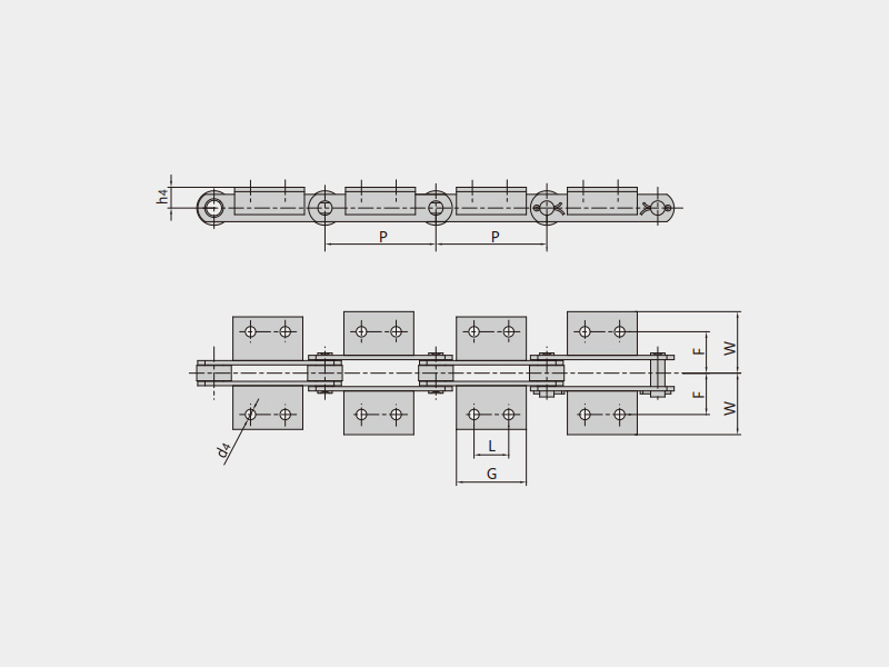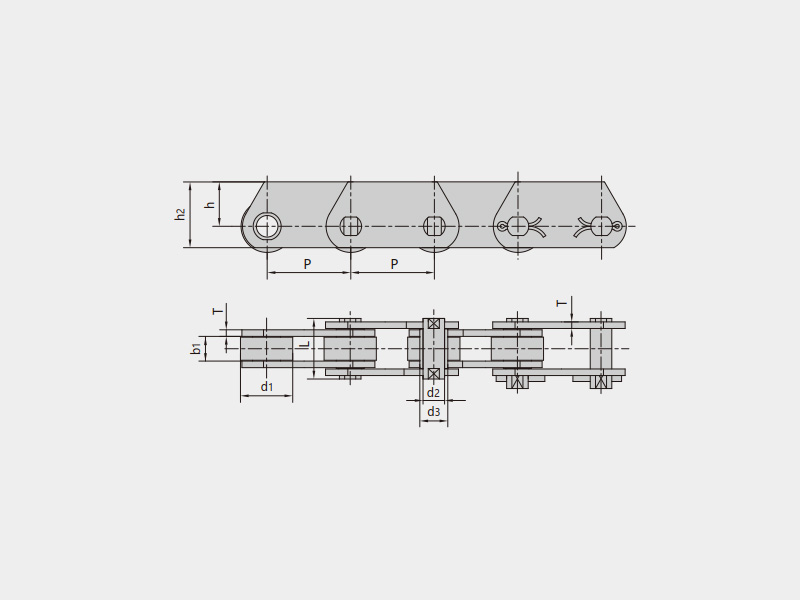● 米制輸送鏈是指鏈條節(jié)距為公制整數(shù)(節(jié)距范圍40mm~1000mm的多種節(jié)距)的滾子鏈或套筒鏈,滾子有多種結(jié)構(gòu)形式,根據(jù)使用工況配置各種附件。